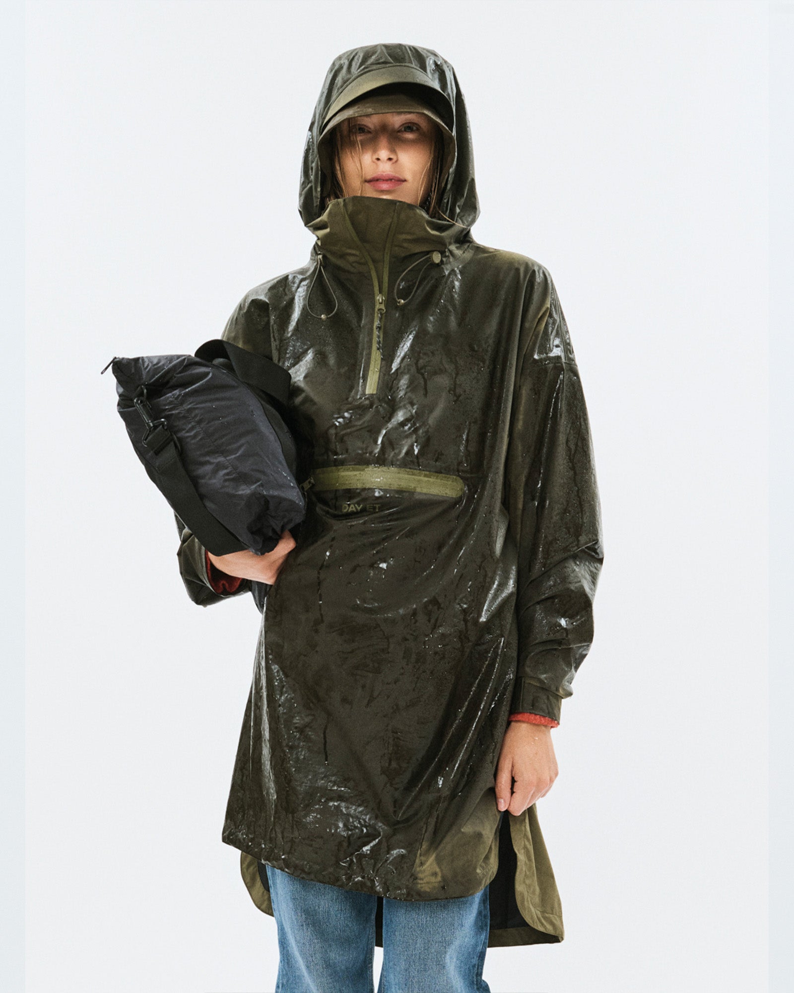 This functional rain anorak is designed to keep you dry and comfortable when the weather changes. It features an adjustable hood with a storm brim that can be customised at the sides for optimal protection. At the front, it closes with a waterproof zip with dart detail, and the spacious front pocket with waterproof zip keeps your essentials safe. Velcro at the cuffs ensures an adjustable fit, while sporty cord details and a practical hanging loop complete the design. With taped seams and a 10,000 mm water column pressure rating, it offers reliable protection even in heavy rain. When the sun comes out, the anorak can be folded into its own pocket and transformed into a messenger bag – perfect to bring along on the go. The model is 175 cm tall and wears a size S.