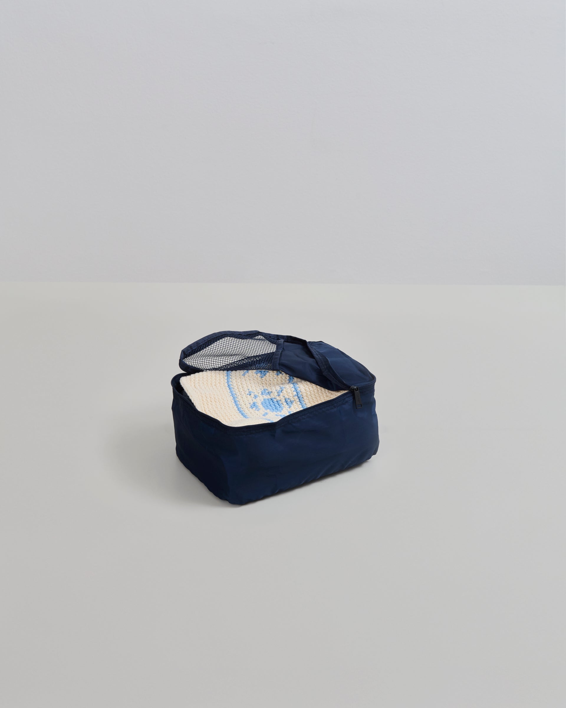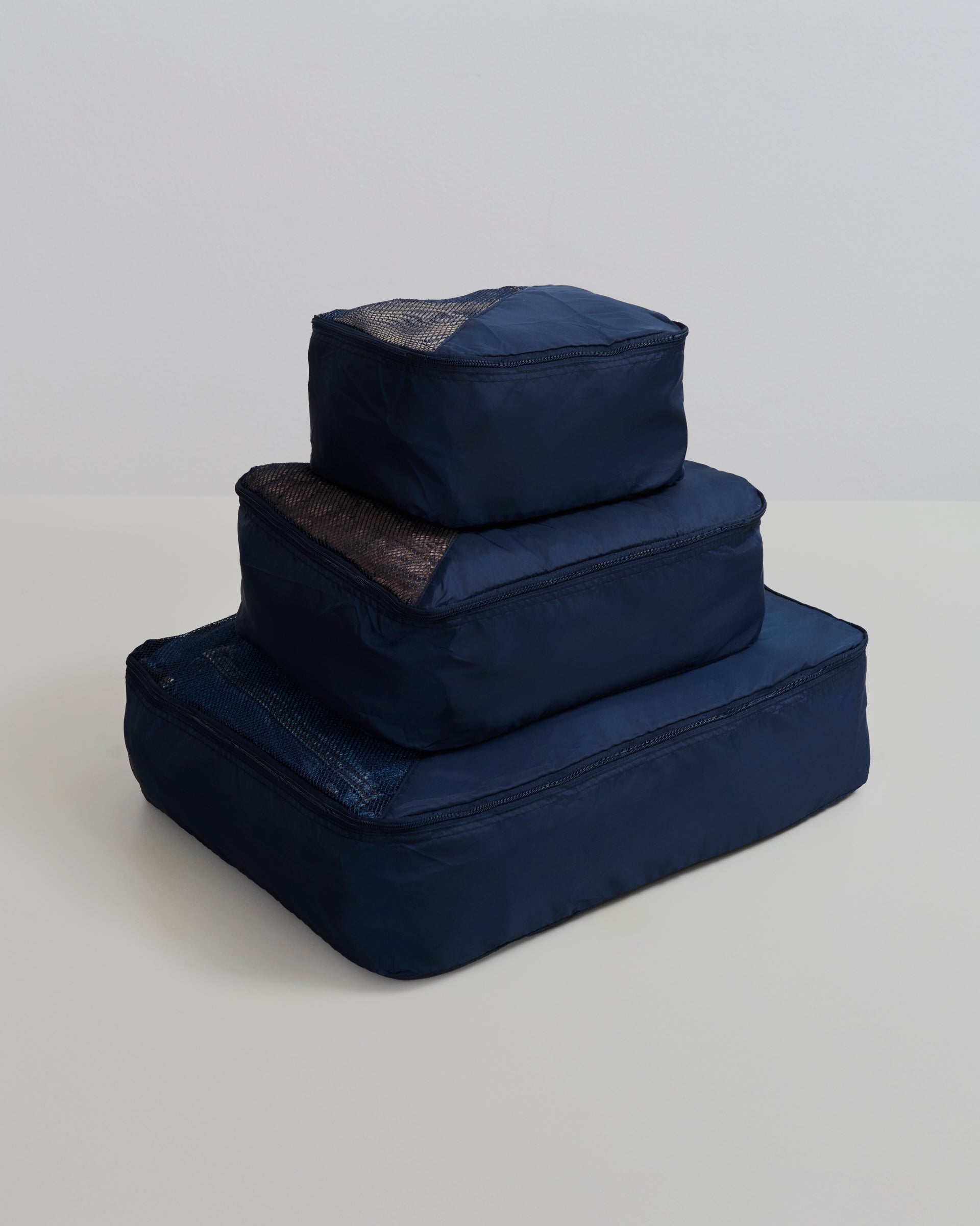 This set of packing cubes includes sizes S, M, and L, designed to help you organize your belongings when packing your suitcase. The main fabric are made of lightweight recycled materials and feature zipper closures. Each packing cube is equipped with a mesh top for easy visibility of your packed items.