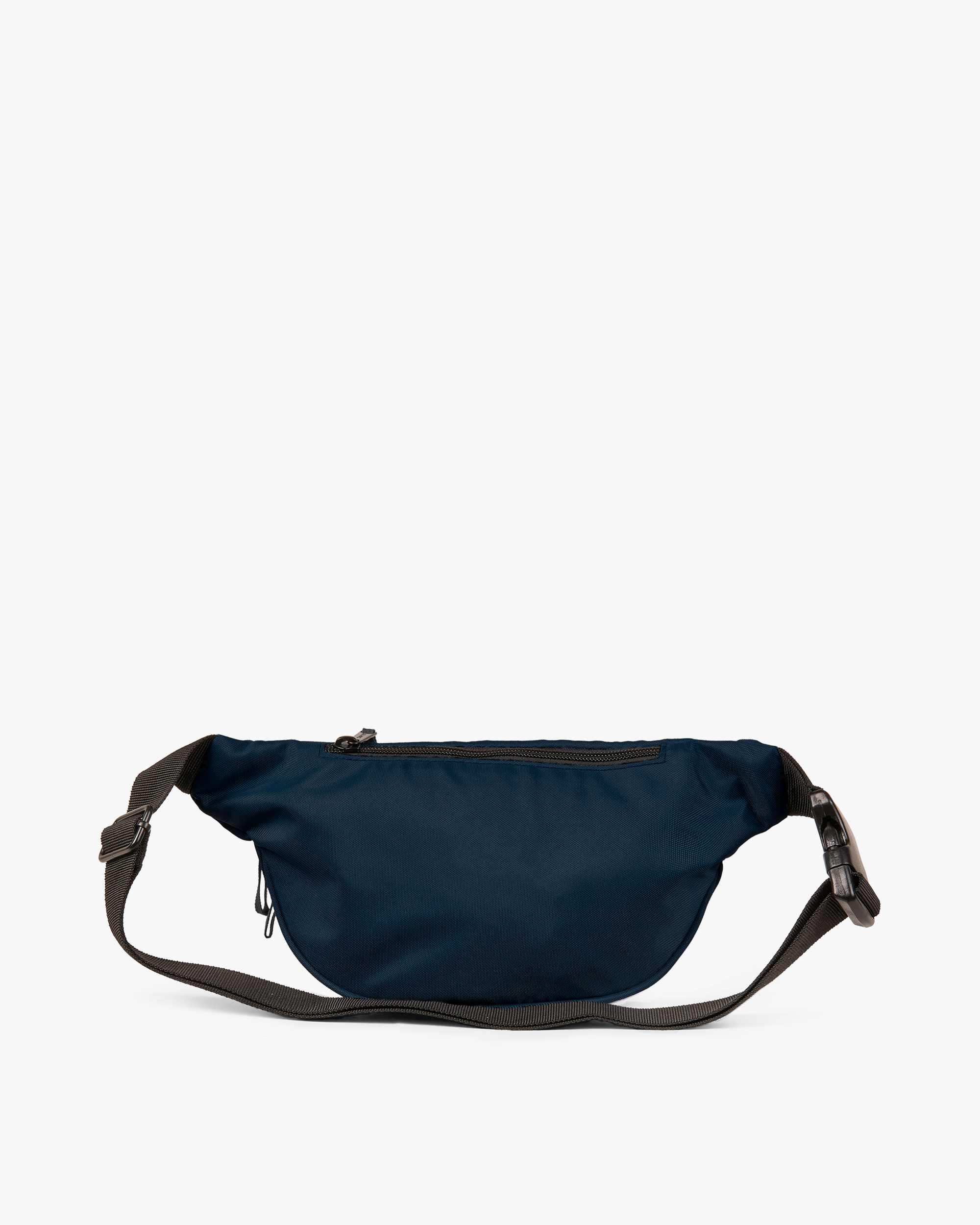 This functional bum bag features a classic design, and its outer fabric and inner lining are made of 100% certified recycled material. The bag closes with a zipper and has a capacity of 1.5 liters. Inside the main compartment, there is an inner pocket, and at the back of the bag, there is a zippered pocket for easy organisation. The adjustable strap with a buckle allows you to customise the fit, making it wearable both as a crossbody and around the waist.