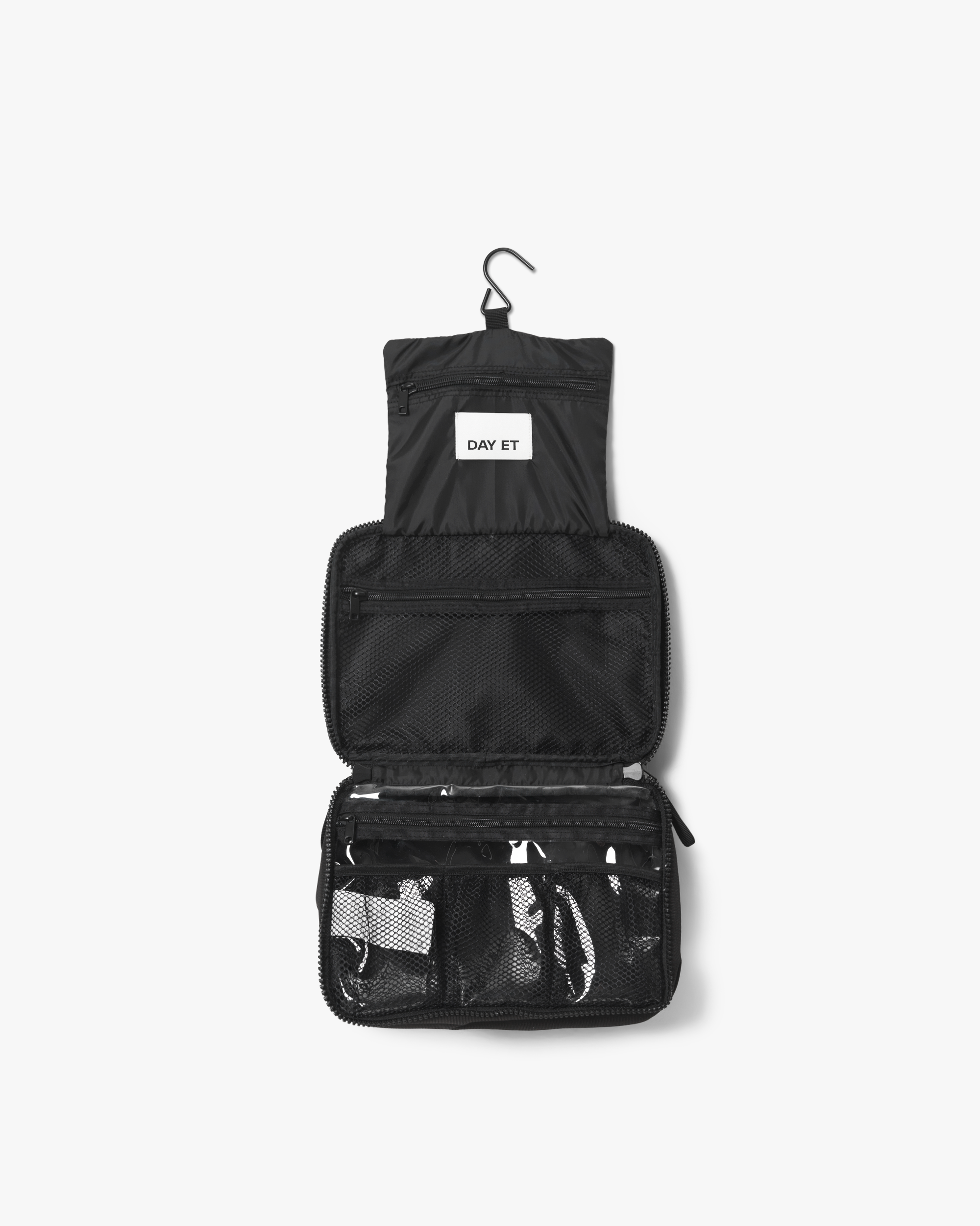 This fold-out washbag is ideal for travel, with a hook for easy hanging in bathrooms or closets. Inside, it has a plastic-lined main compartment for separating damp and dry items, a mesh pocket in the lid, three elastic mesh compartments, and a zip pocket for smaller items. Crafted from durable material with a solid zip, it's built to last - and faux leather trim adds a smart finishing touch.