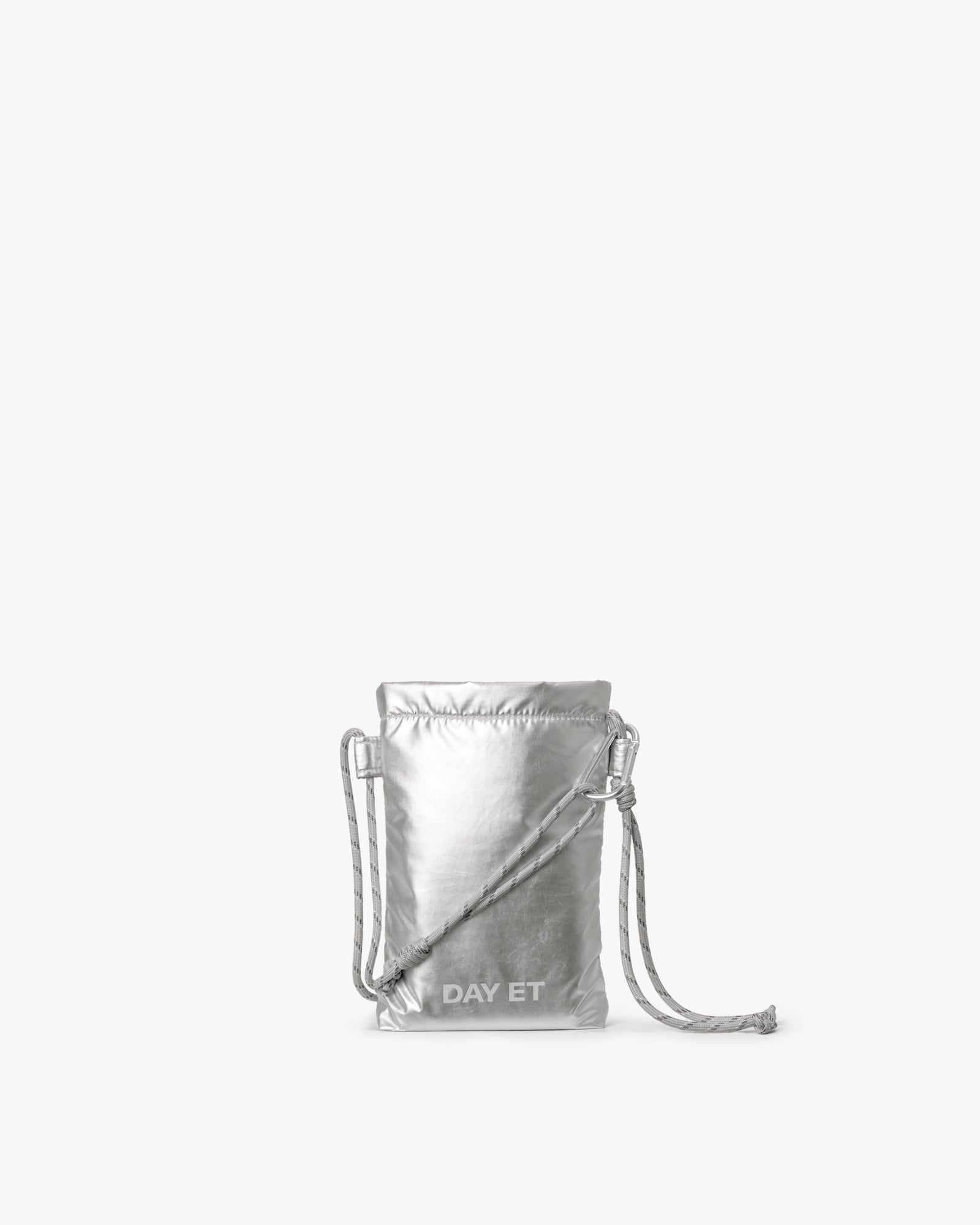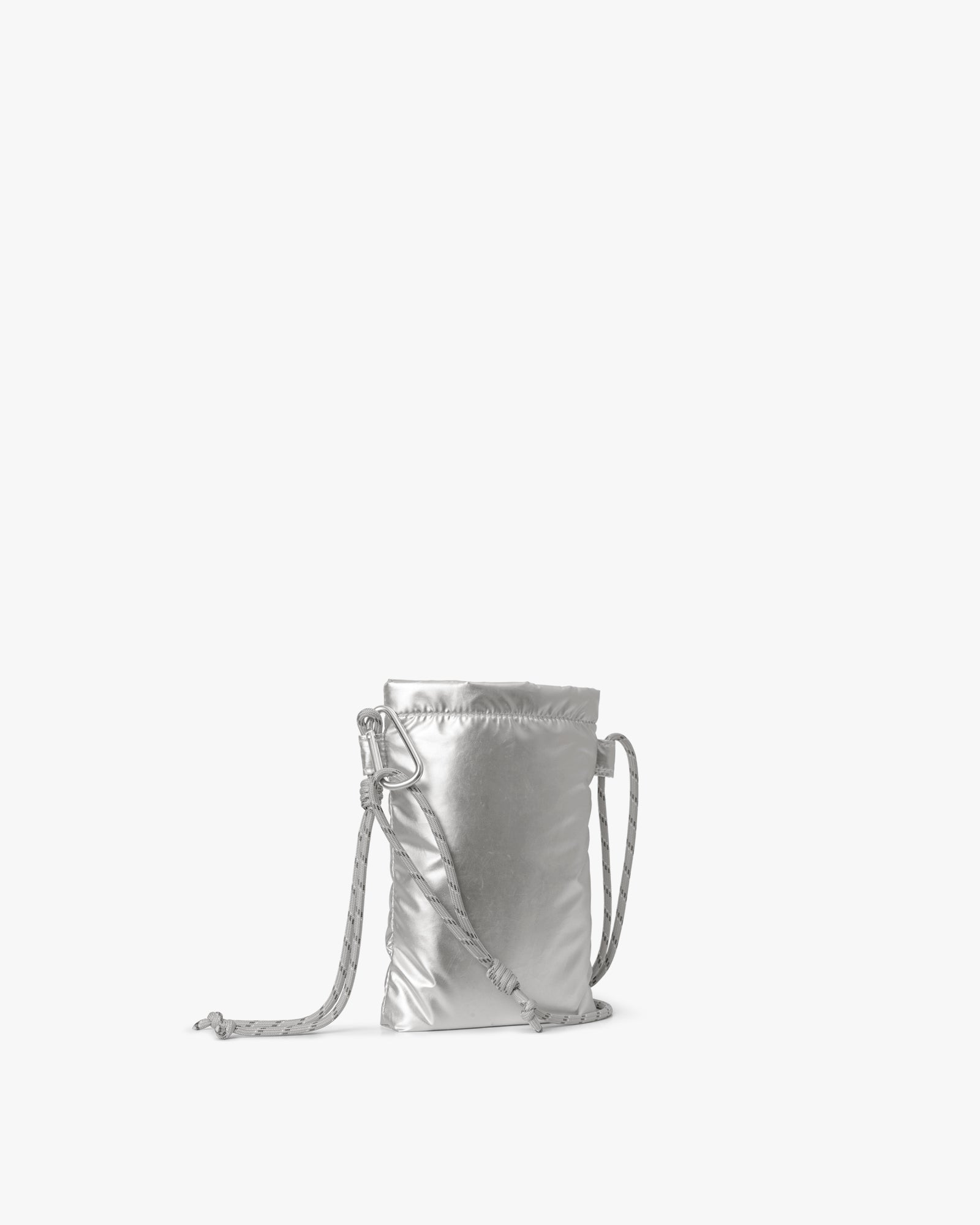 A compact design made to keep your phone close when you're on the go. The adjustable paracord strap allows for a comfortable fit, and the carabiner makes it easy to detach - great for wearing under a jacket or attaching to another bag. The lightweight fabric and silver finish give it a clean, practical look. The outer and inner fabric is made from 100% certified recycled materials.