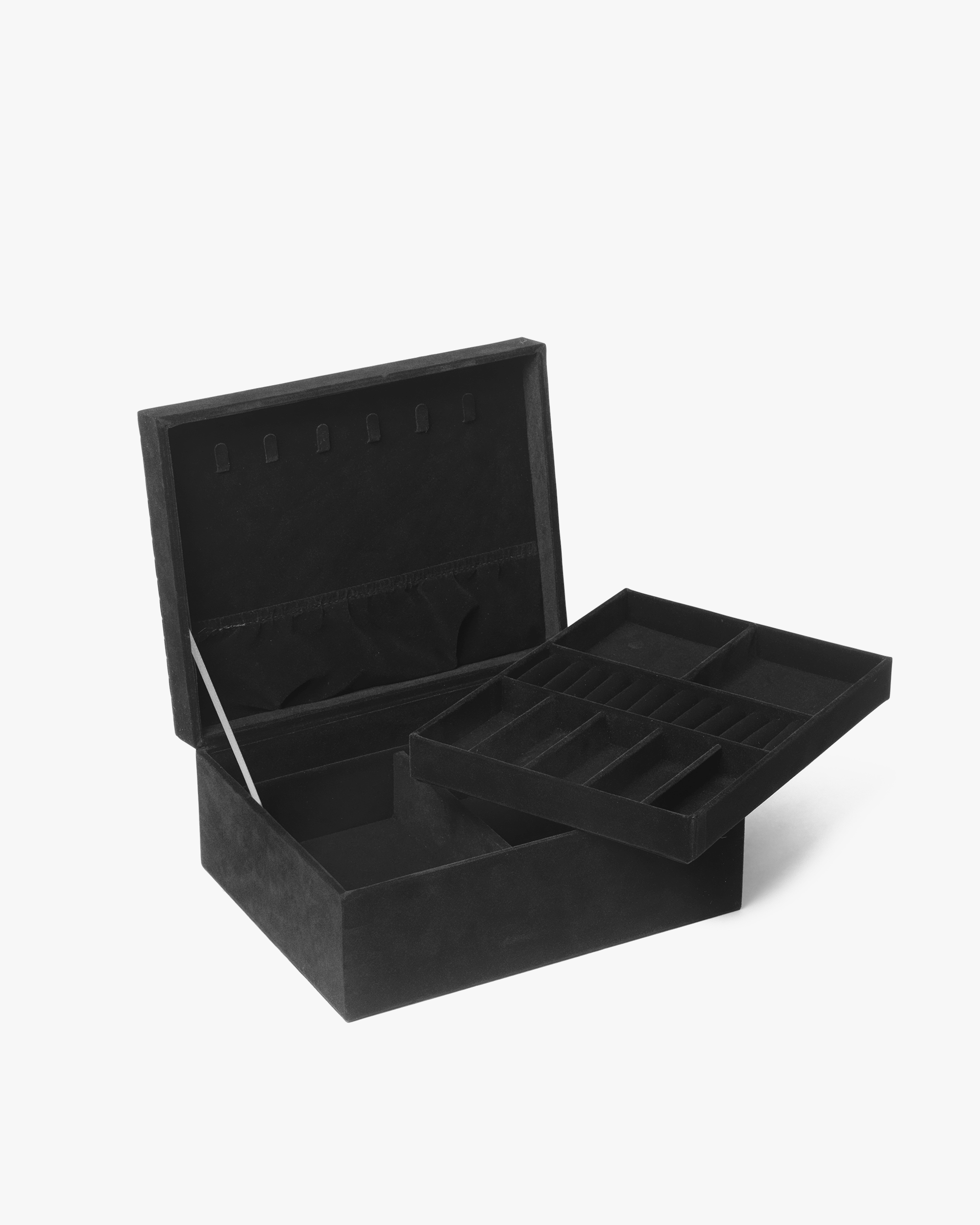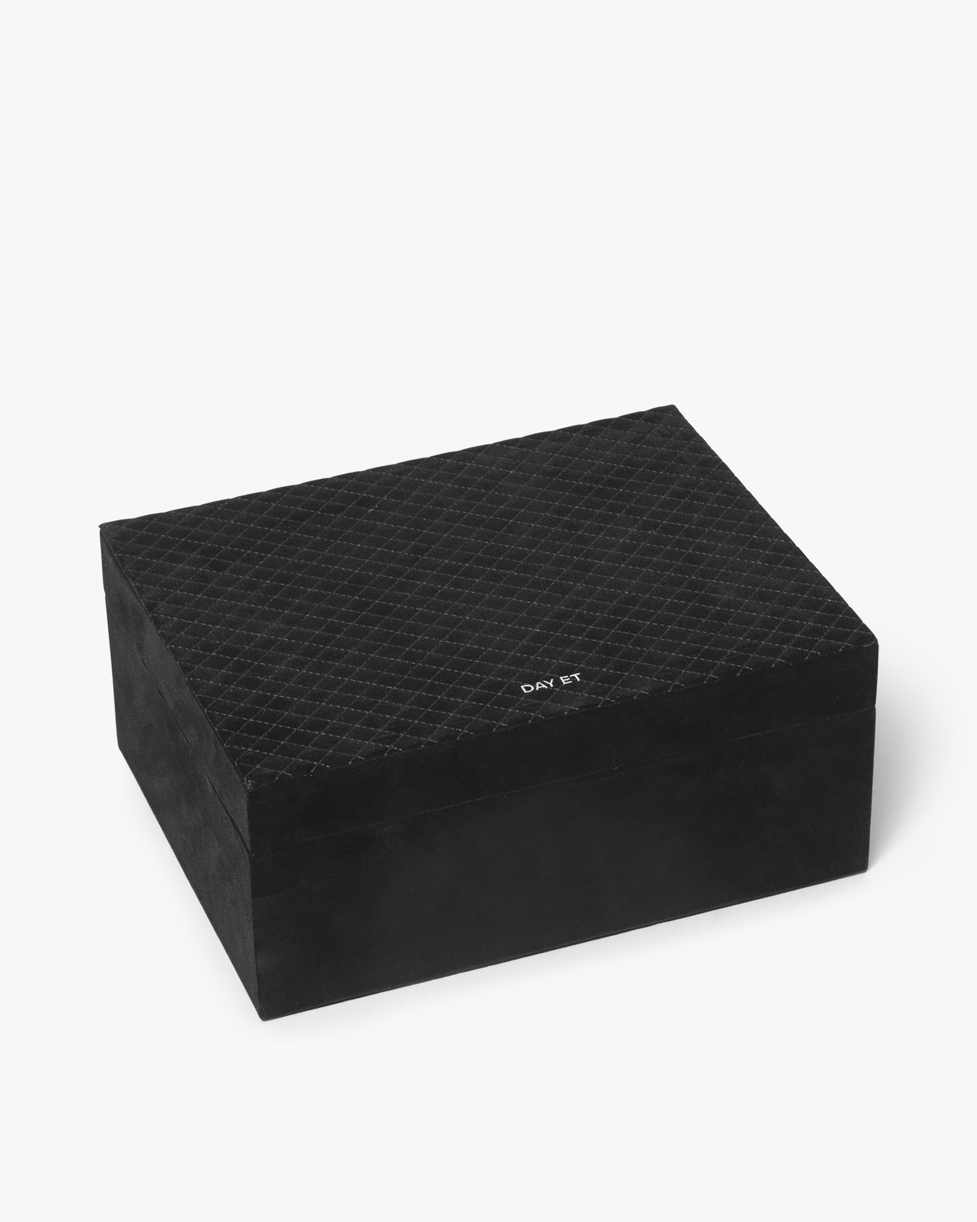This spacious jewellery box is perfect for storing all your jewellery. It is designed in velvet with quilt details and has the Day Et logo in silver on the front. It has a magnetic closure, and inside, there are multiple functional compartments for organizing your jewelry. Additionally, it includes a removable tray that offers an extra compartment for storing your pieces.