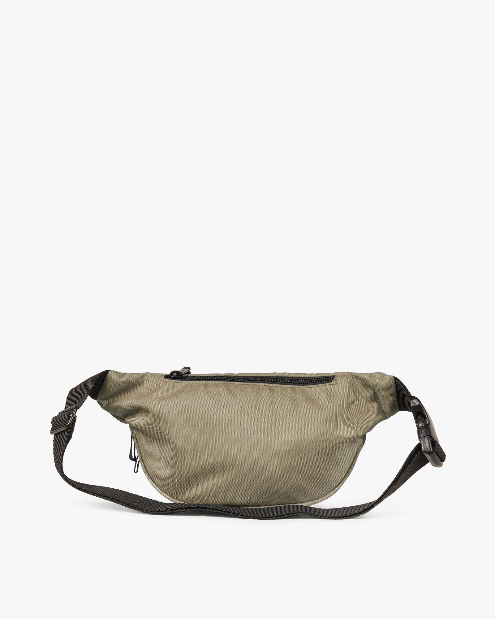 This functional bum bag features a classic design, and its outer fabric and inner lining are made of 100% certified recycled material. The bag closes with a zipper and has a capacity of 1.5 liters. Inside the main compartment, there is an inner pocket, and at the back of the bag, there is a zippered pocket for easy organisation. The adjustable strap with a buckle allows you to customise the fit, making it wearable both as a crossbody and around the waist.