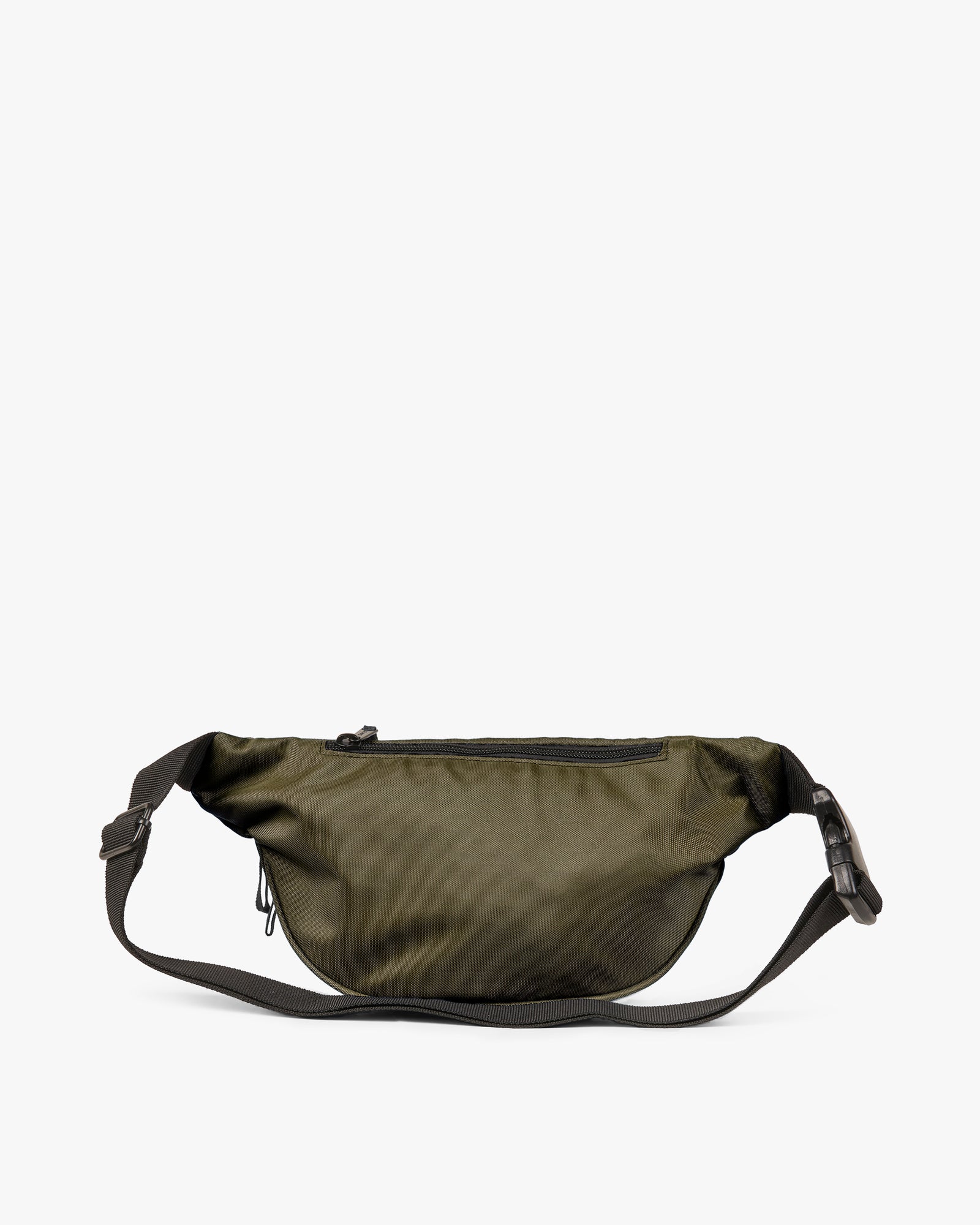 This functional bum bag features a classic design, and its outer fabric and inner lining are made of 100% certified recycled material. The bag closes with a zipper and has a capacity of 1.5 liters. Inside the main compartment, there is an inner pocket, and at the back of the bag, there is a zippered pocket for easy organisation. The adjustable strap with a buckle allows you to customise the fit, making it wearable both as a crossbody and around the waist.