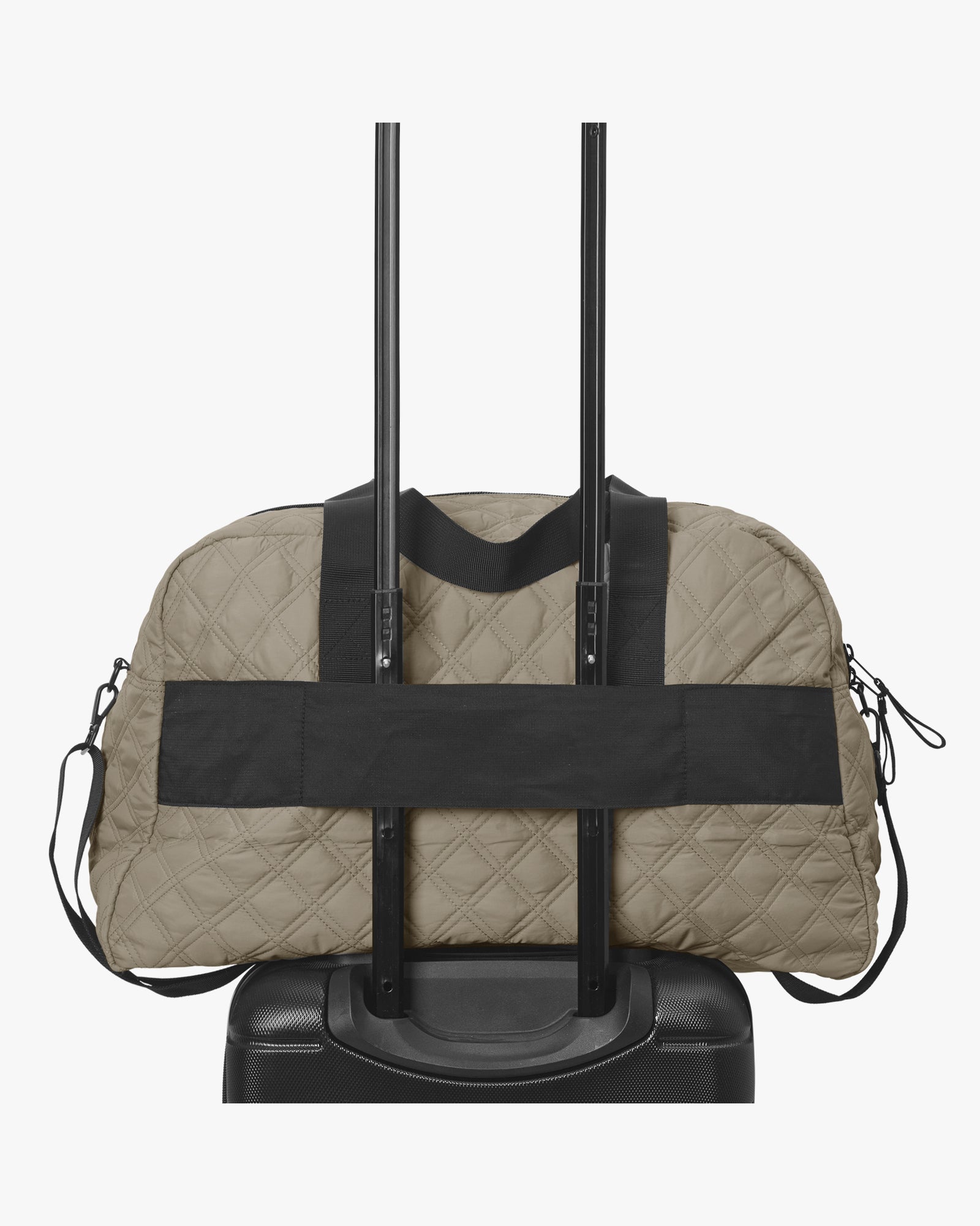 A quilted travel bag with space for your laptop and all your essentials. It features multiple compartments, short handles, and a detachable, adjustable strap for versatile carrying. A back strap makes it easy to attach to your suitcase. Both the outer fabric and lining are made from 100% certified recycled materials.
