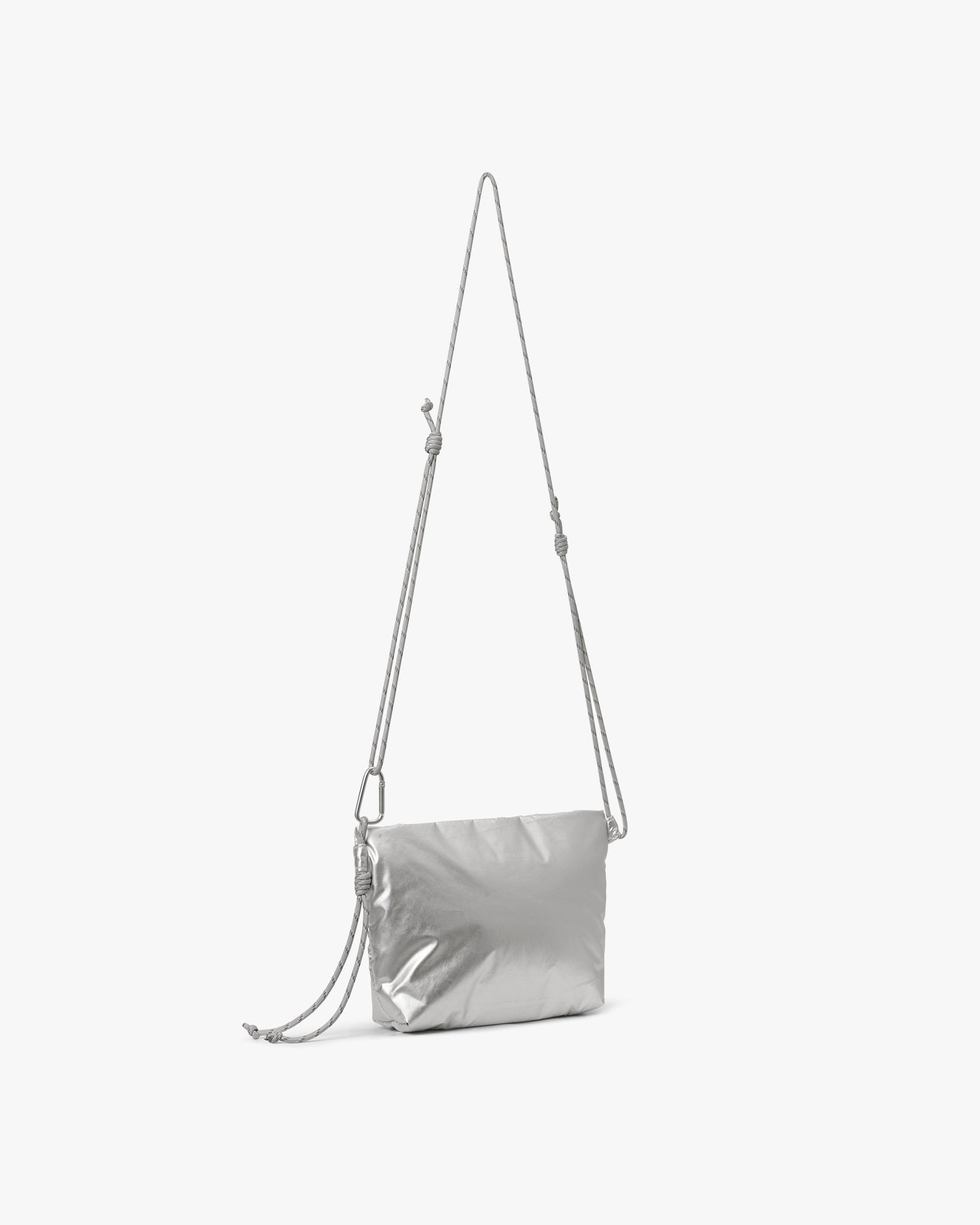 A compact crossbody made from padded, shiny material, featuring a practical mesh divider inside the main compartment. It closes with a recessed zip and paracord pull, while the adjustable strap offers a flexible fit. The carabiner makes it easy to remove quickly — ideal for days on the go or when attaching it to another bag.