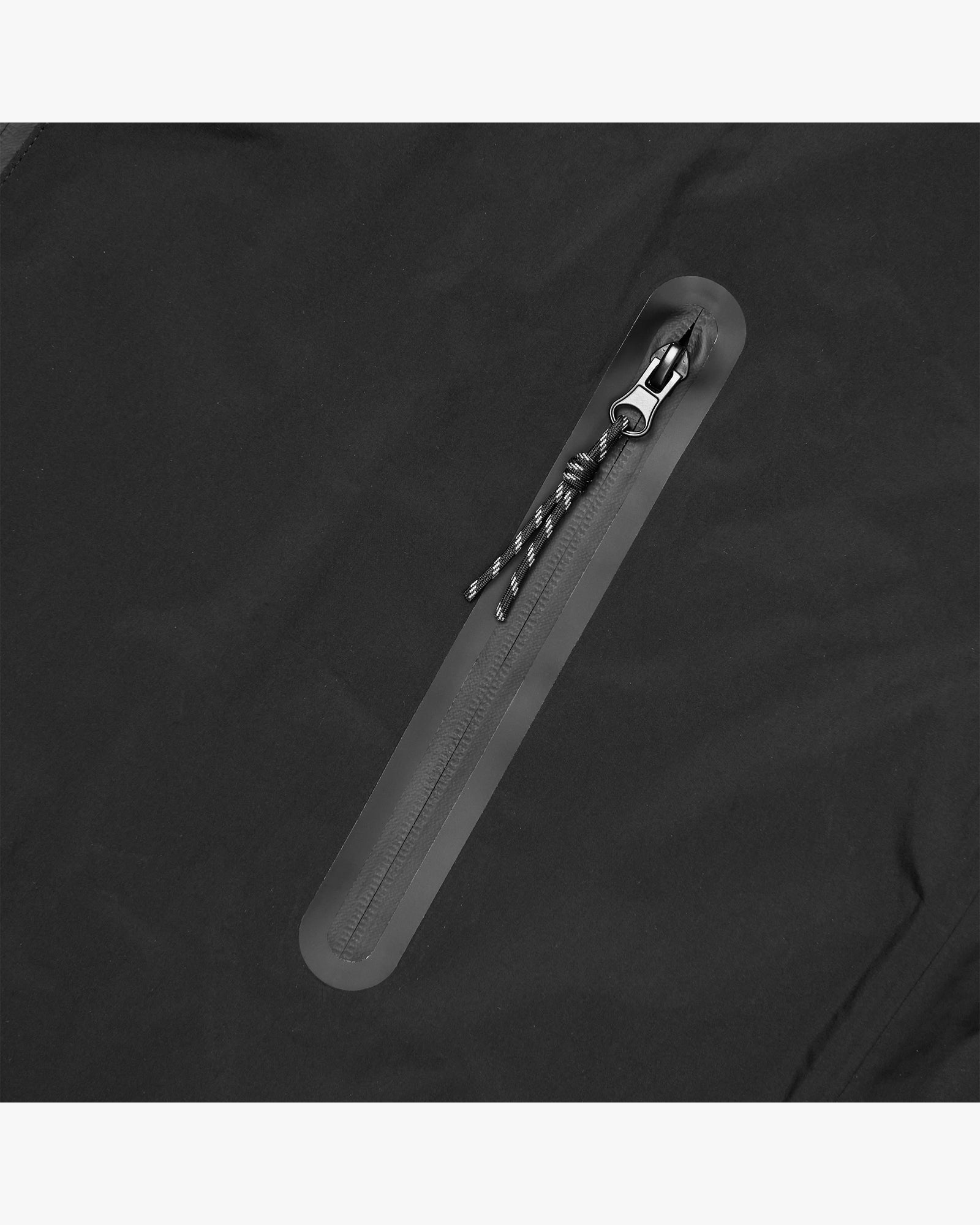 This functional raincoat is designed to keep you dry and comfortable, even on the rainiest days. It features an adjustable hood with a storm brim that can be customised at both the sides and back for optimal protection. The coat closes with a waterproof two-way zip, making it practical for cycling, while a chin guard ensures extra comfort. Two front pockets with waterproof zips keep your belongings safe, and Velcro at the cuffs together with an elastic drawstring at the waist provide a more fitted silhouette. Inside, it is finished with mesh lining and back ventilation openings for improved breathability. Sporty cord details on the zips, a practical hanging loop and elastic shoulder straps that allow the coat to be worn open complete the design. With taped seams and ability to withstand a 10,000 mm water column pressure, it is built to withstand even heavy rain. The model is 175 cm tall and wears a size S.
