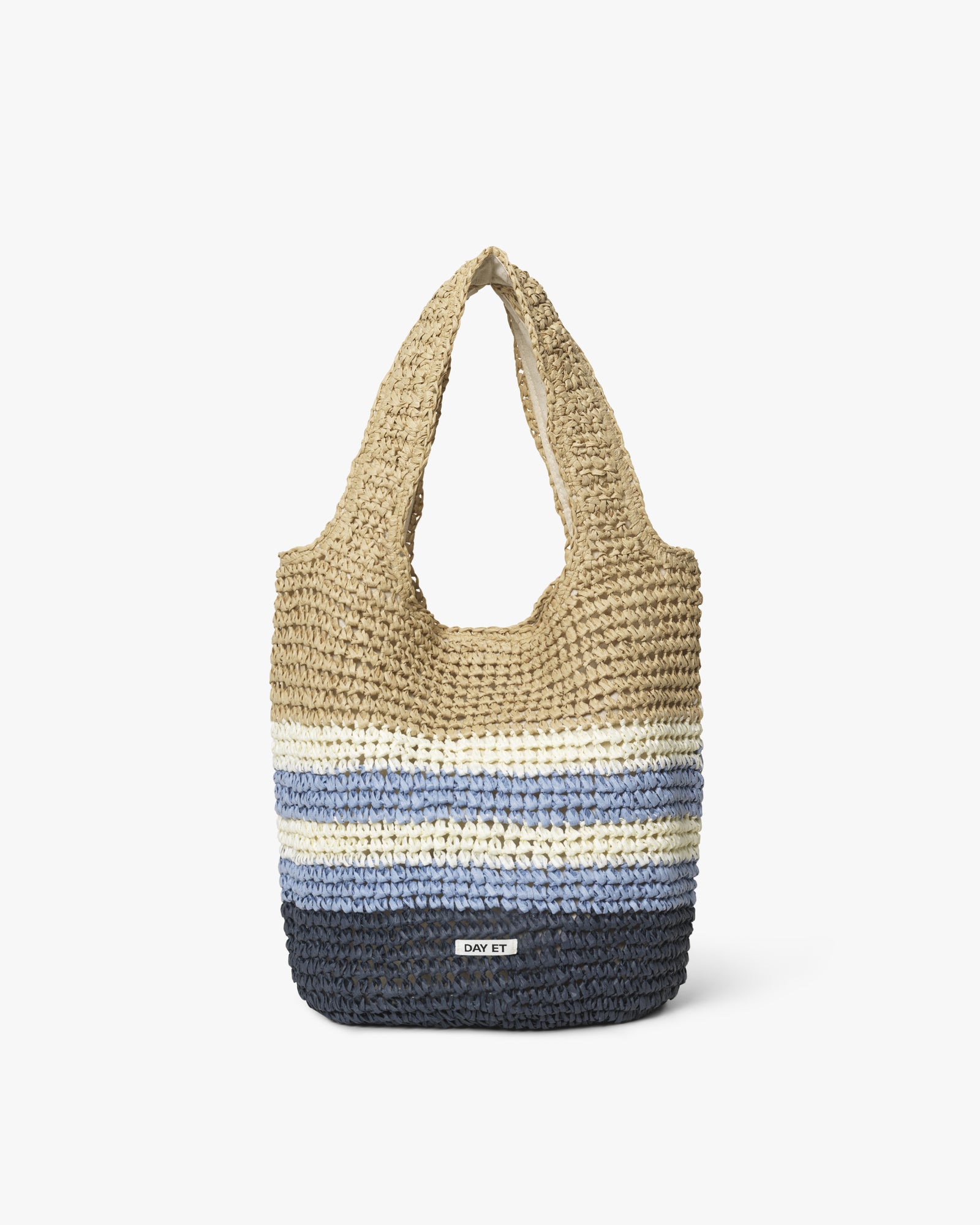 This deep shoulder bag is crocheted from durable straw material for a light and natural feel. It features a round base and closes with a snap button. Lined with soft beige linen, it also includes a zip pocket for secure storage.