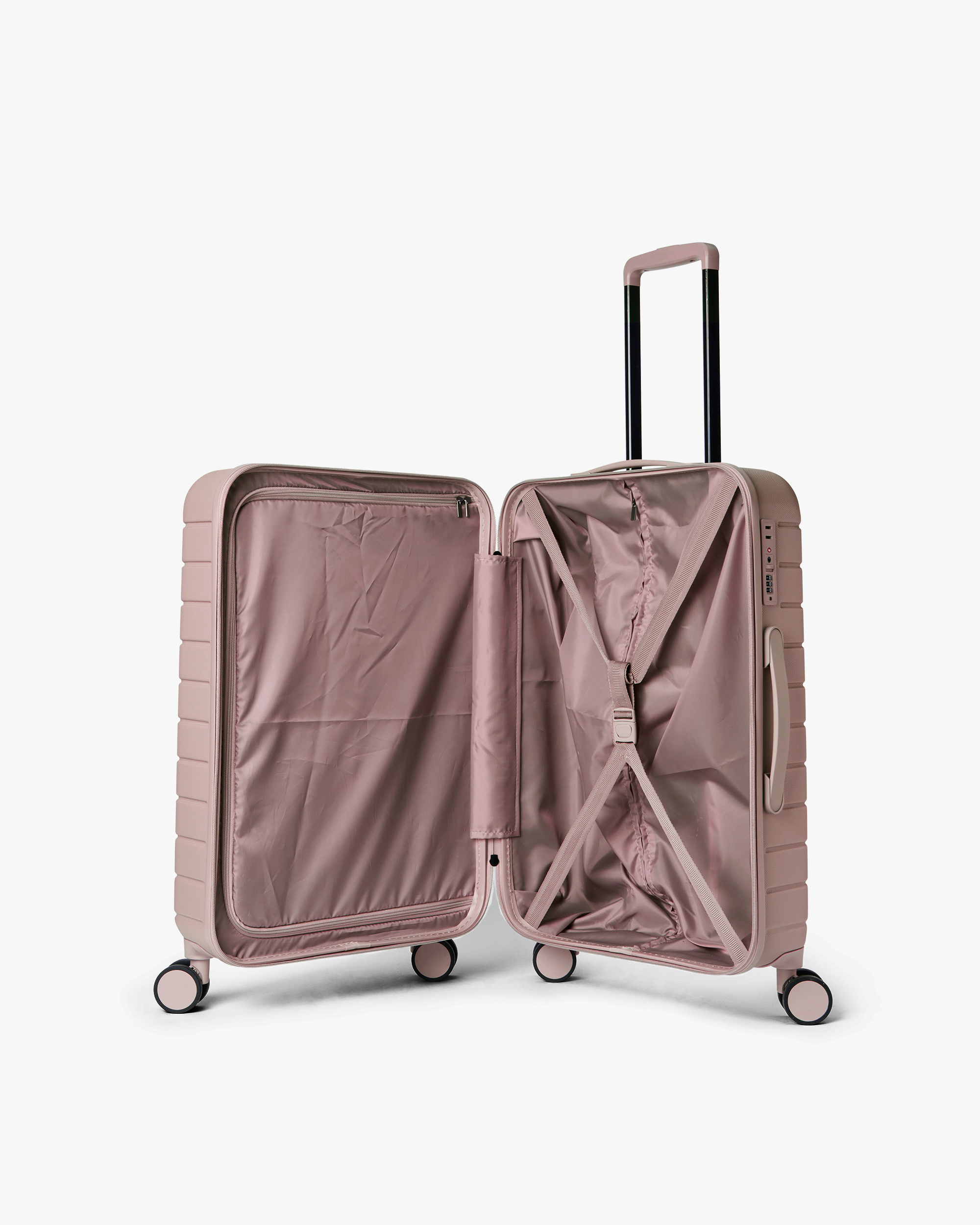This practical suitcase is equipped with a zippered compartment and packing straps, it lets you keep all your belongings organised in a classic design. Containing up to 65 litres, it has 4 double wheels that can rotate 360 degrees, enabling you to push it around smoothly. Made of lightweight and durable hard case material, the suitcase includes a TSA-approved lock to keep your belongings safe. Designed with the classic DAY ET-logo.