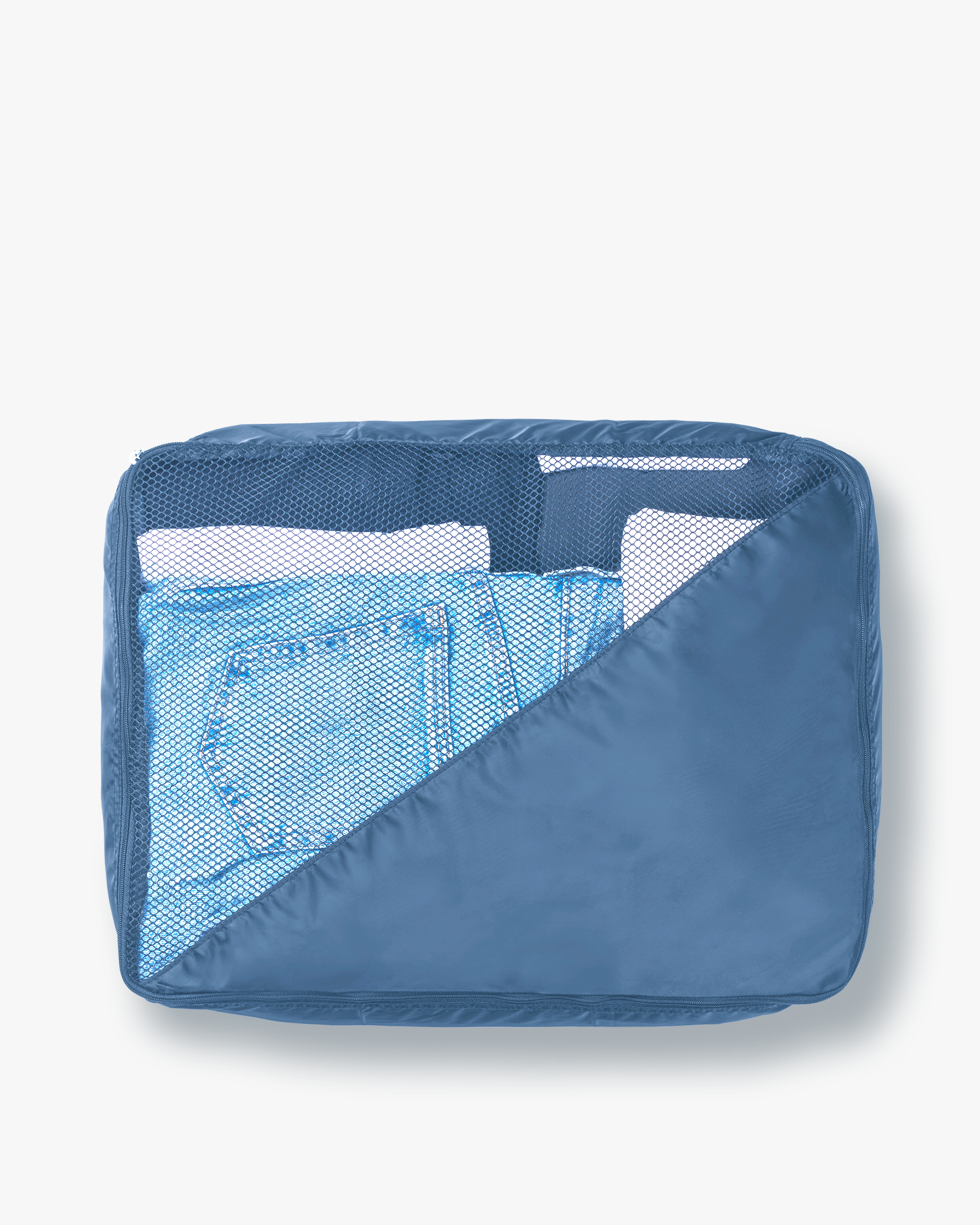 This packing cube can be used to organize your belongings when you pack your suitcase. The main fabric is made from certified recycled material and closes with a zipper. The top of the packing cube is made of mesh material, so you can easily see what you have packed. It is a size L.