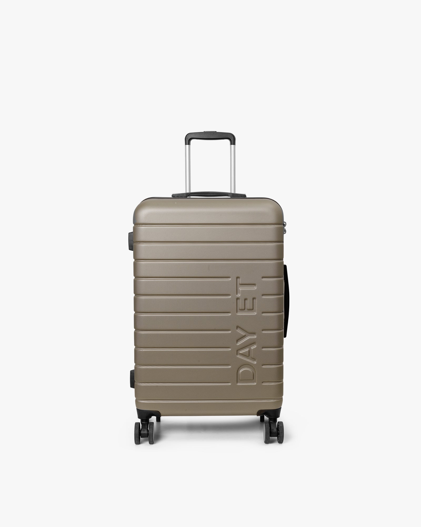 A medium-sized check-in suitcase offering generous capacity and smart features. It includes packing straps and a separate zip compartment to help keep your belongings in order during travel. The four double 360-degree spinner wheels provide smooth mobility, and the lightweight hardcase construction ensures your items stay protected. Finished with silver detailing on the zip and wheels, and the DAY ET logo on the front, it also features a TSA-approved lock for added security.