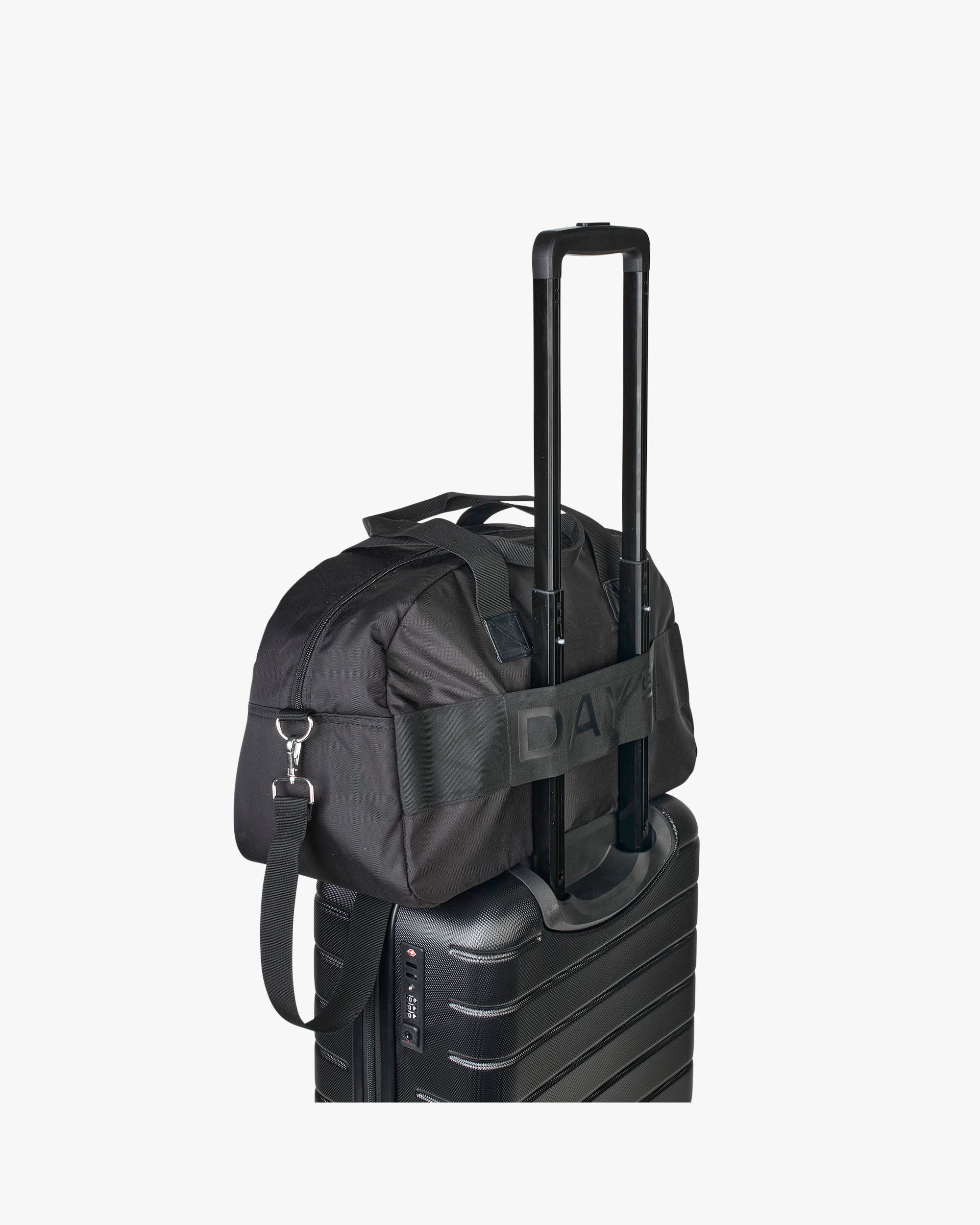 This bag is perfect for a small getaway. The outer fabric and the inner lining is made of 100% certified recycled material. In the spacious main compartment you can store everything you need for a couple of overnight stays, and in the inside zipper pocket you can keep your smaller items. The bag has two shorter handles and a detachable and adjustable strap, so you can both carry it over the shoulder and as a crossbody. The bag also has a front pocket and a strap on the back, so it can be put over the handle of a suitcase.