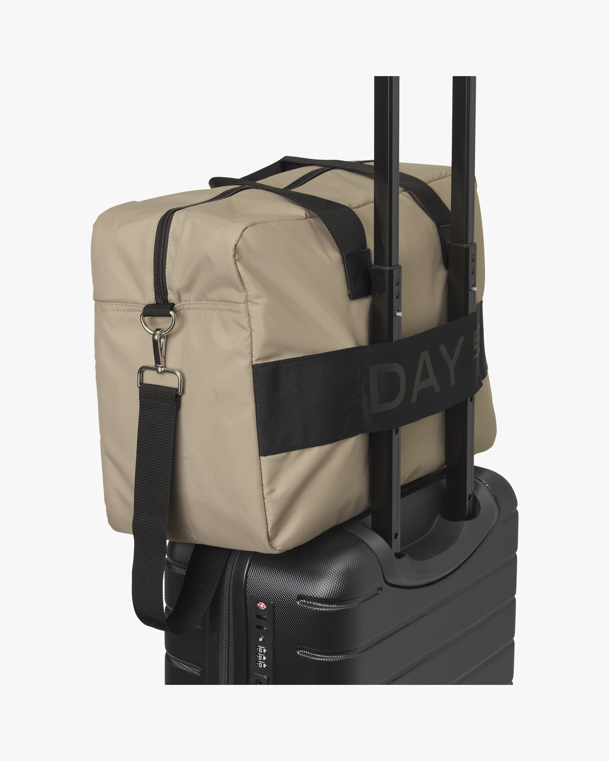 This bag is perfect for a trip or a getaway. The outer fabric and the inner lining is made of 100% certified recycled material. It is closed with a zipper, and in the main compartment there is space for everything you need during for a couple of overnight stays. It has several inside pockets and a outside pocket, so you can organize your stuff. Besides the shorter handles the bag also has an adjustable and detachable strap, so it can both be carried over the shoulder and as a crossbody. It also has a strap on the back, so it can be put over the handle of a suitcase.