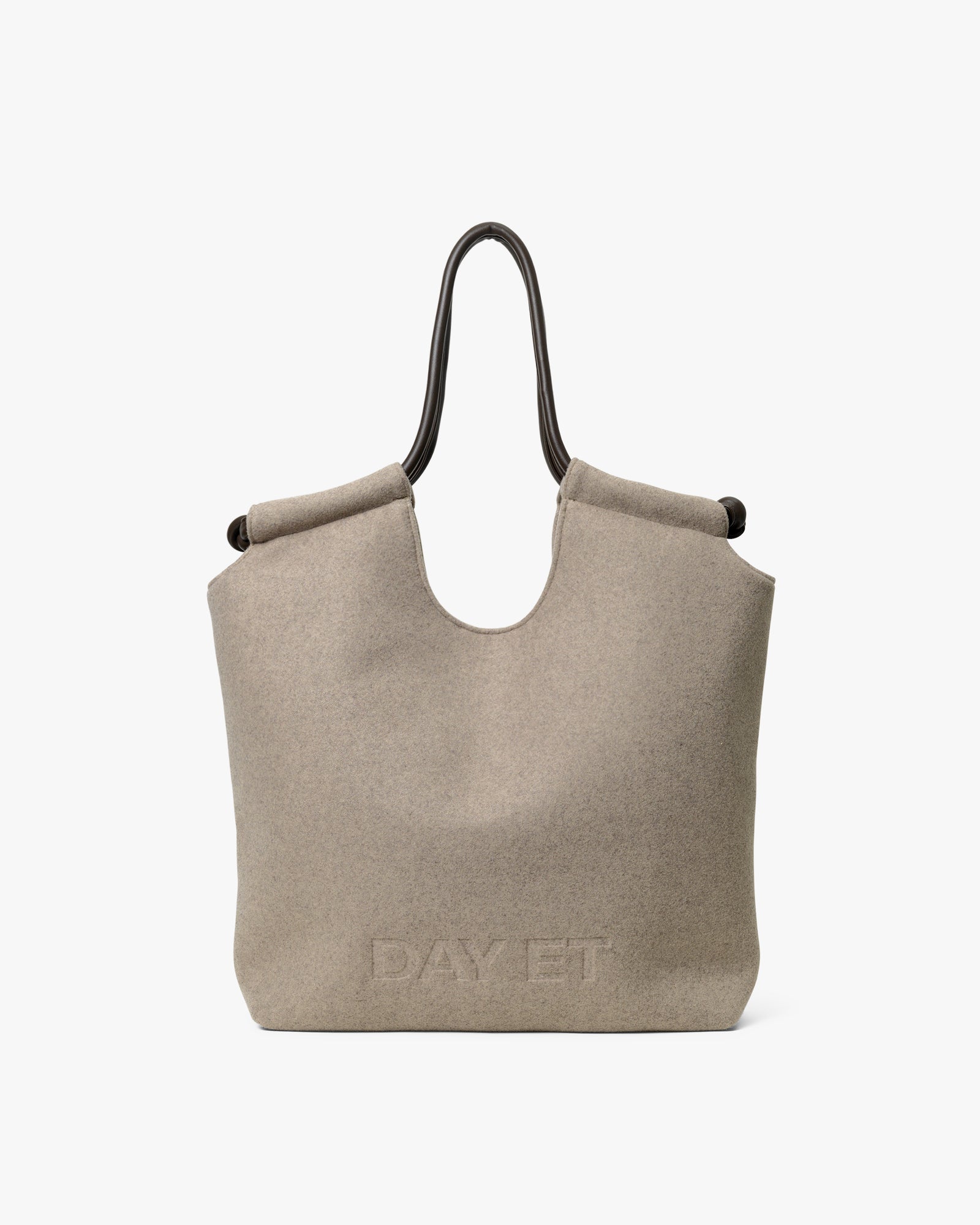A spacious tote bag made from soft woollen material, offering a warm and understated look. It accommodates a 15" laptop and secures with a press-stud closure. Inside, there's a practical zip pocket, and the faux leather handle with knotted detail adds a subtle, distinctive touch. A bag that blends functionality with elegant design.